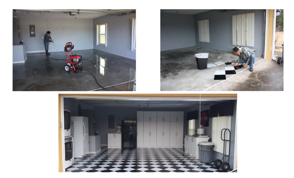 Gene purchased black and white garage floor tiles to complete a 2 car garage.